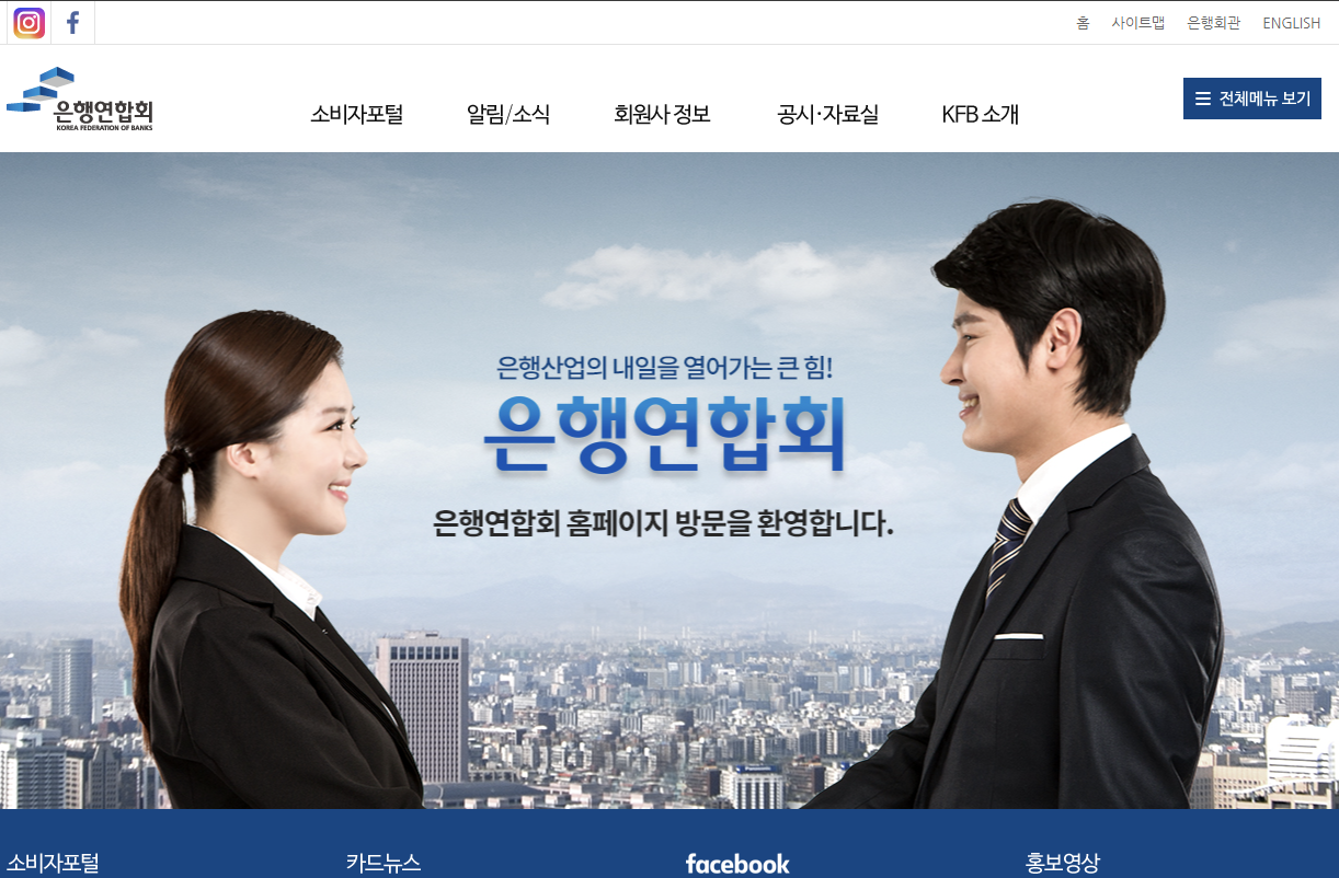 접속을 하면 은행 산업의 내일을 열어가는 큰 힘! 을 외치며 미남 미녀분이 미소짓고 있습니다. 우리도 이 두 분의 미소처럼 이자를 보고 환하게 미소지어봐요. 다시 주제로 돌아와서... 아래와 같이 메뉴를 클릭합니다.