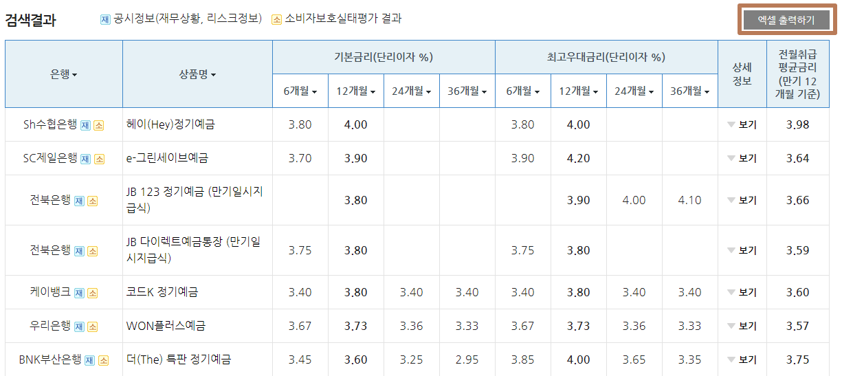 이자율이 높은 정기예금을 확인할 수 있습니다. 1년/단리 기준으로는 현재 SH 수협은행의 헤이 정기예금이 가장 이자율이 높네요. 이자율이 높은 것만 보시고 바로 가입하진 마세요. 상품을 직접 확인해서, 어떤 상품인지에 대해 기본적인 정보는 습득하고 가입하시길 추천드립니다.