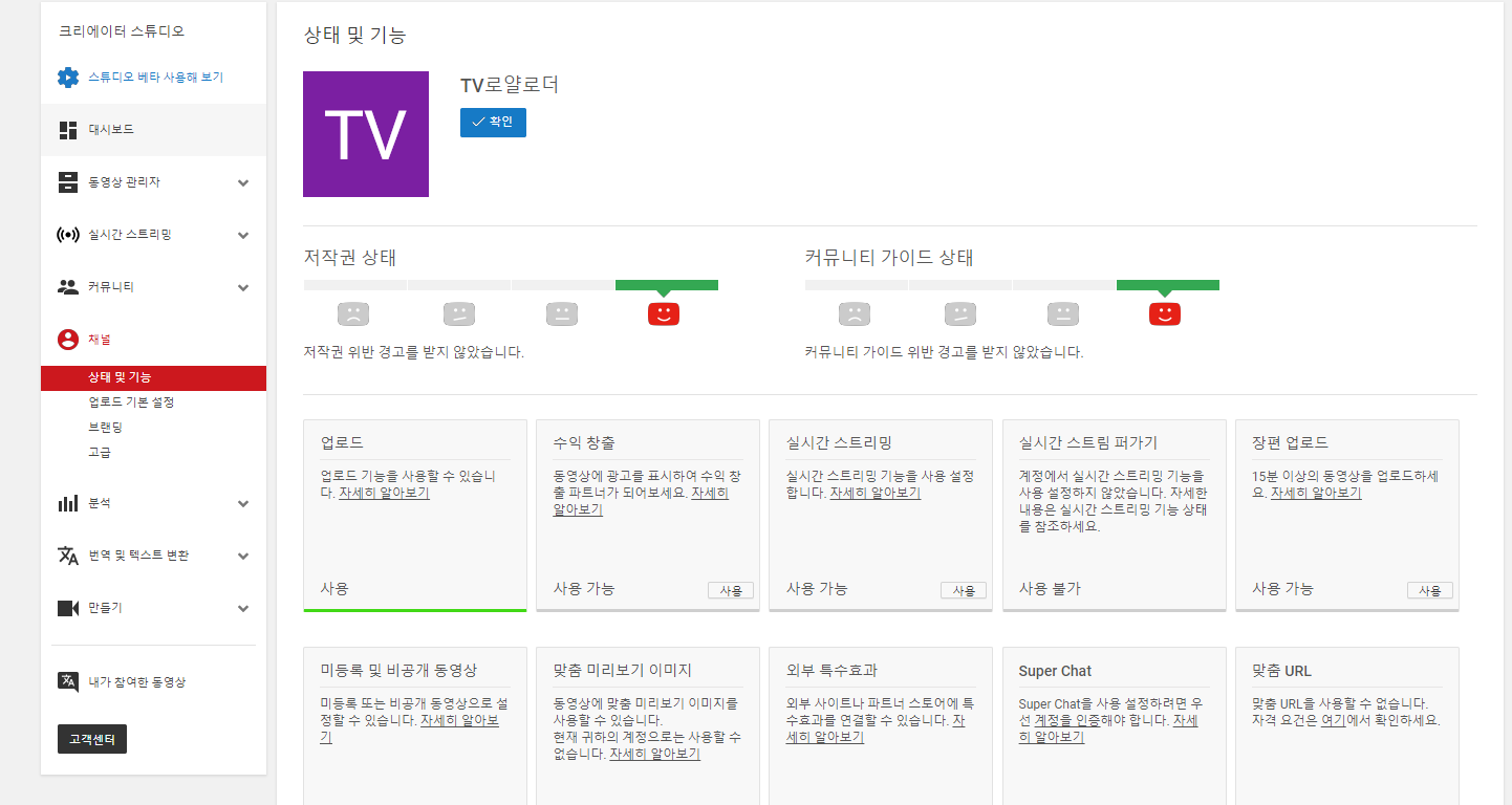 채널 메뉴를 클릭하면 상태 및 기능들이 보여요.