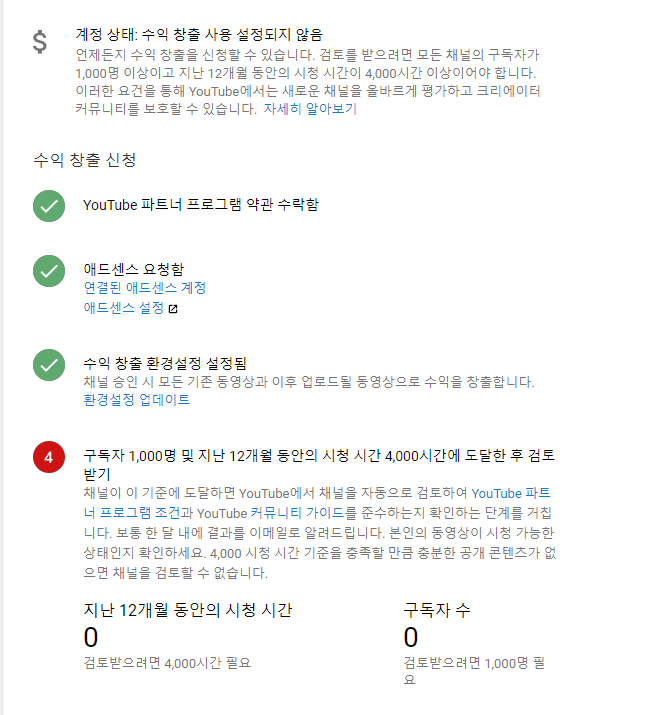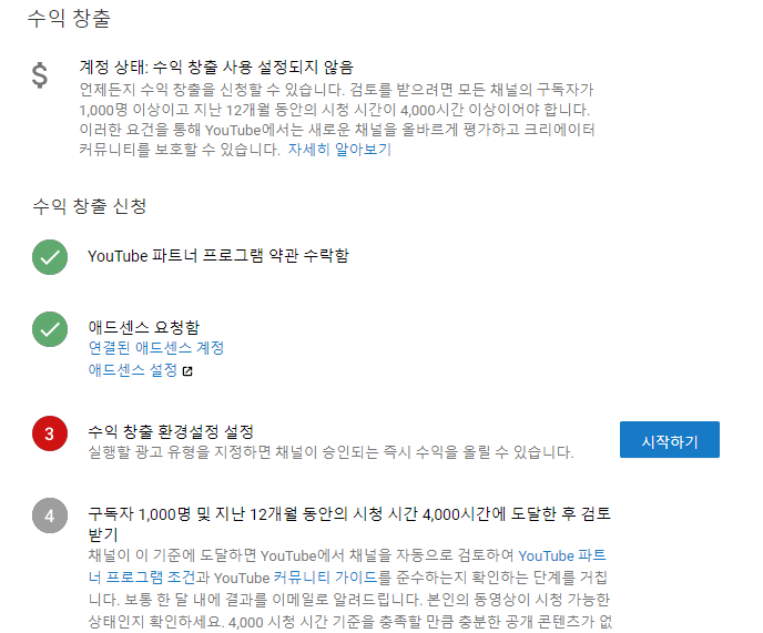 사용 버튼을 누르면 이렇게 수익창출 신청을 할 수 있는 단계가 보여요.