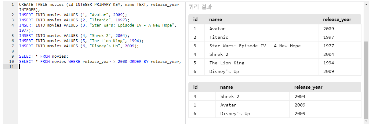 CREATE TABLE movies (id INTEGER PRIMARY KEY, name TEXT, release_year INTEGER);